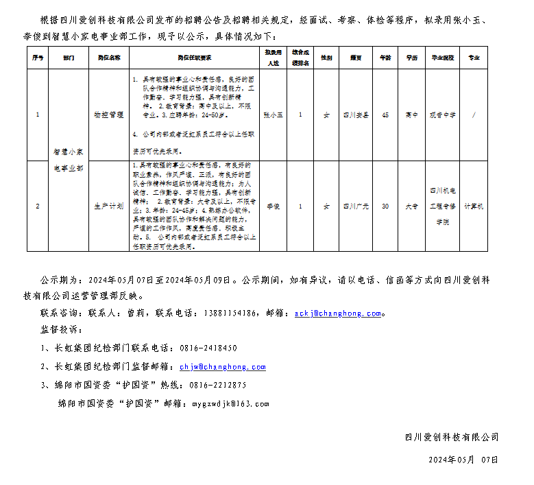 四川愛創科技有限公司關于招聘物控管理等崗位擬錄用人員的公示