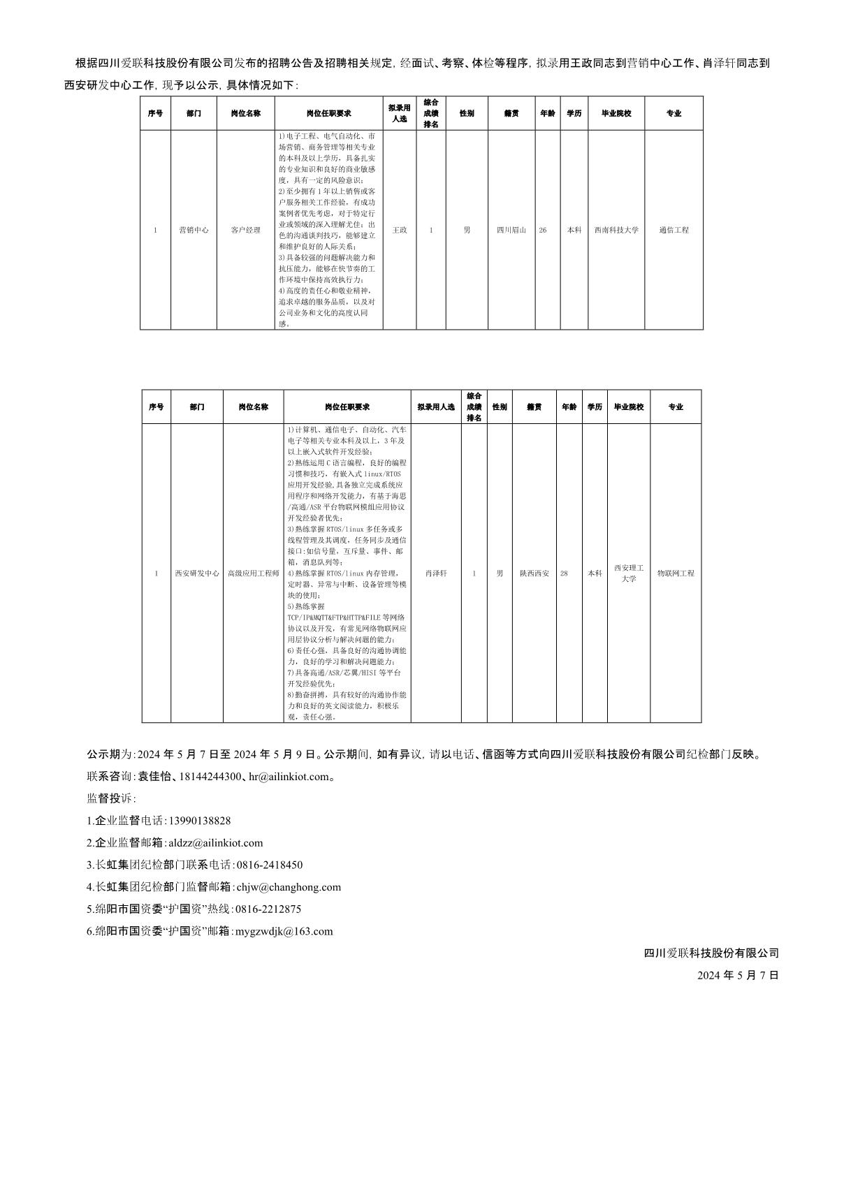 四川愛聯科技股份有限公司關于招聘客戶經理等崗位擬錄用人員的公示
