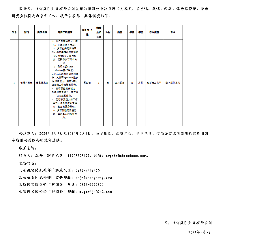 四川長虹集團(tuán)財(cái)務(wù)有限公司關(guān)于招聘信息技術(shù)崗崗位擬錄用人員的公示
