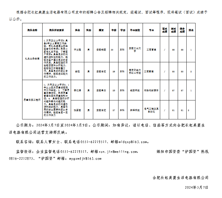 合肥長虹美菱生活電器有限公司關于招聘禮品業務經理測試成績的公示