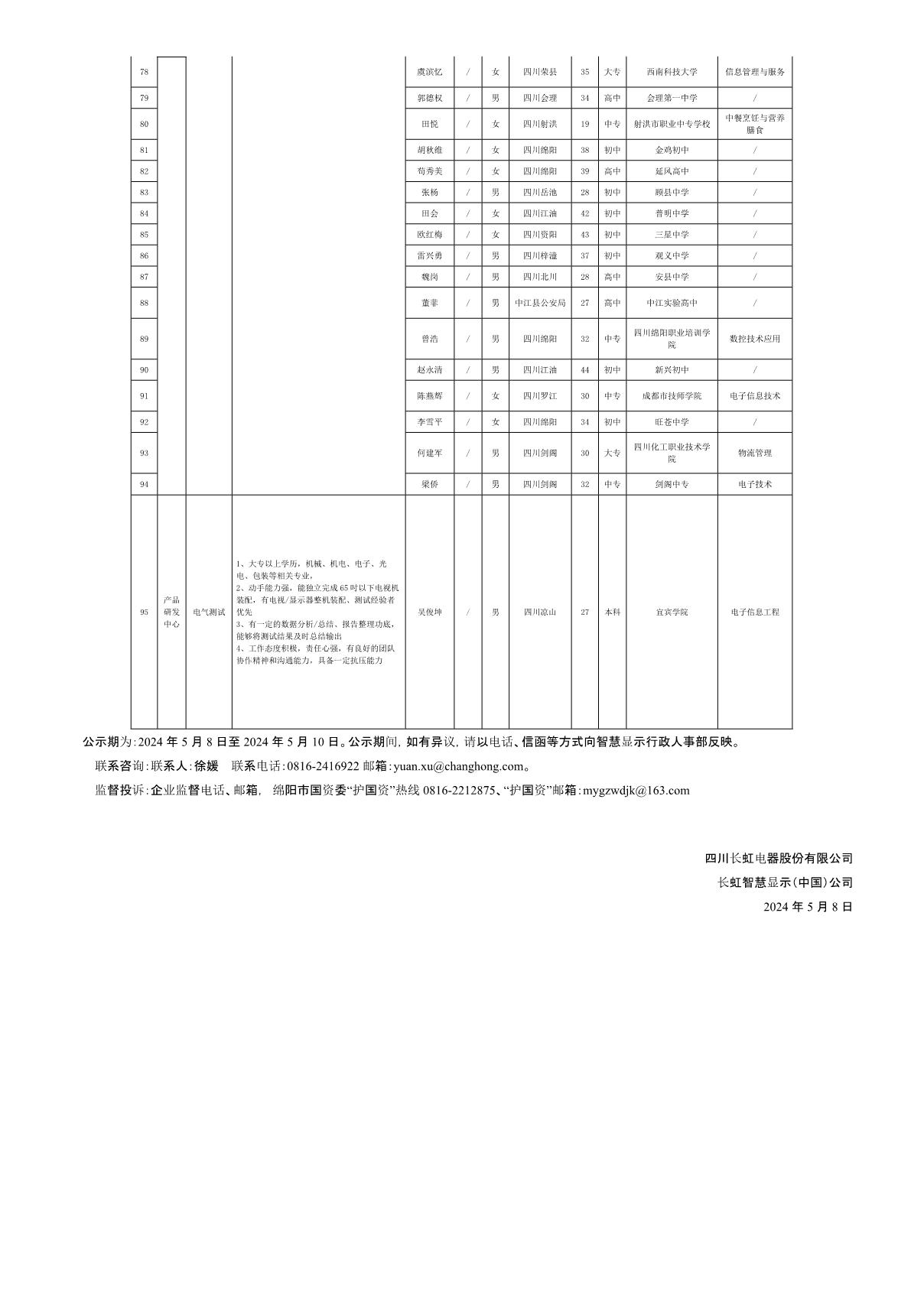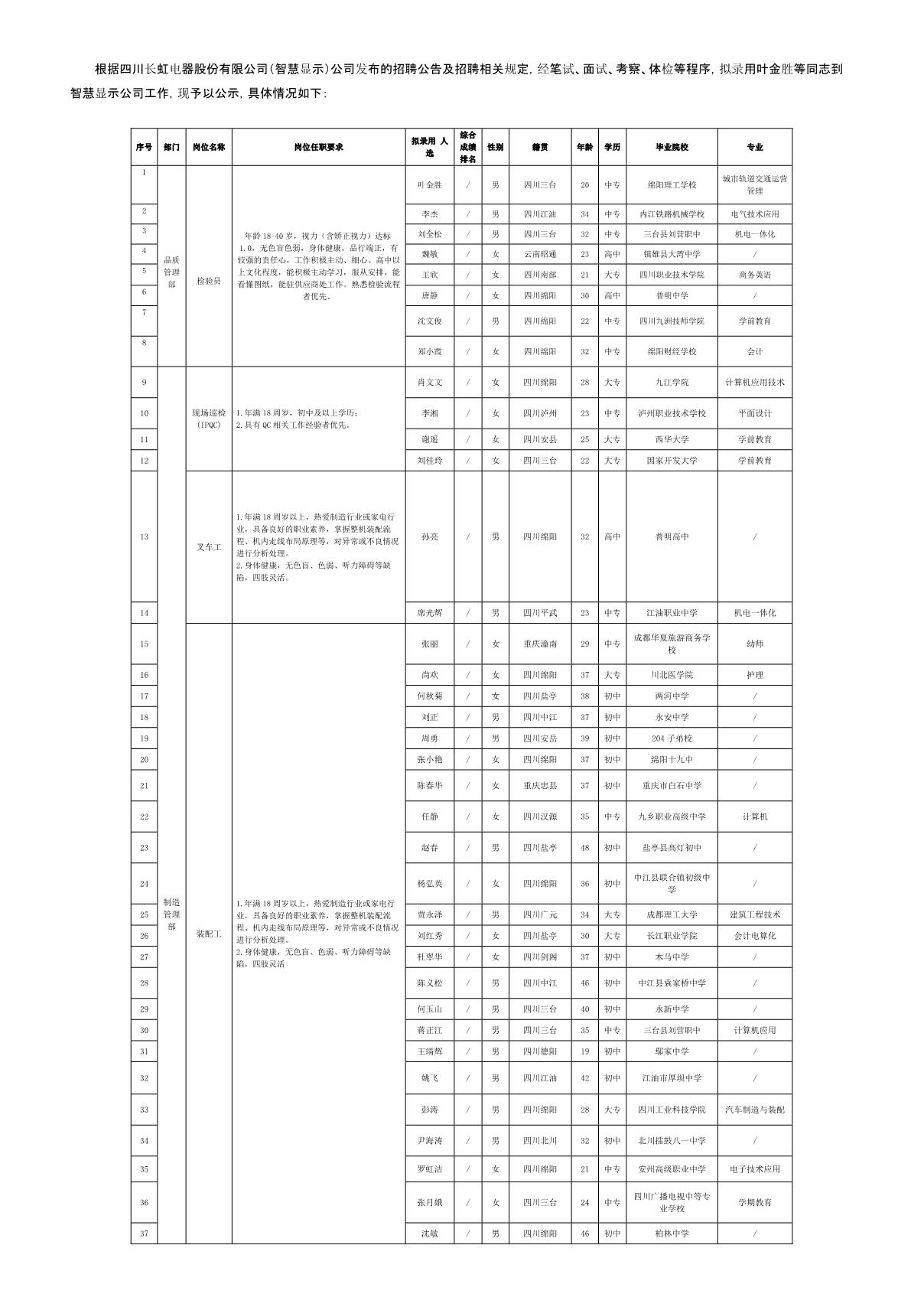 四川長虹電器股份有限公司(智慧顯示)關于招聘檢驗員等崗位擬錄用人員的公示
