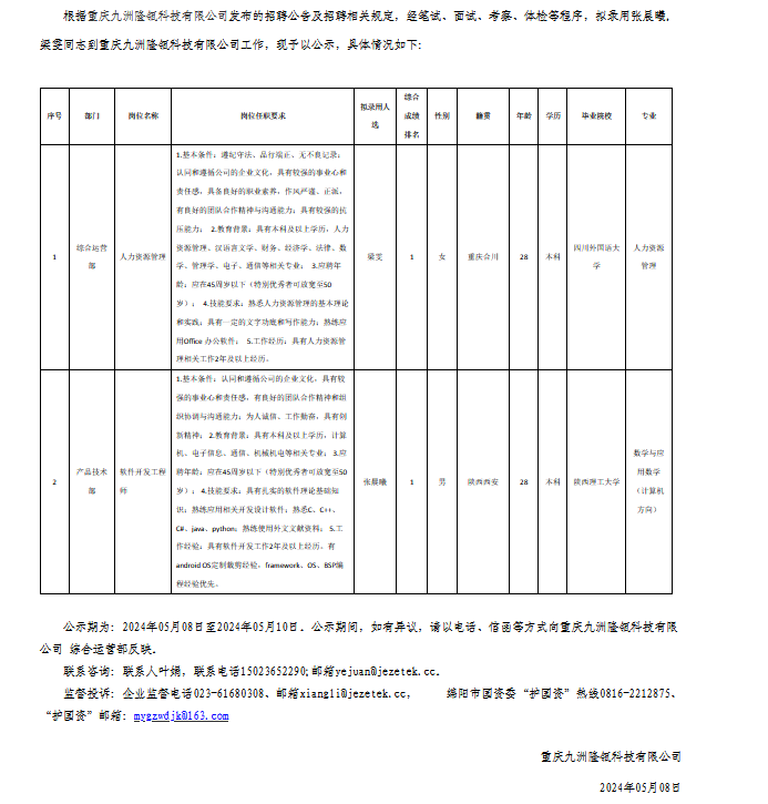 重慶九洲隆瓴科技有限公司關于招聘軟件開發工程師等崗位擬錄用人員的公示