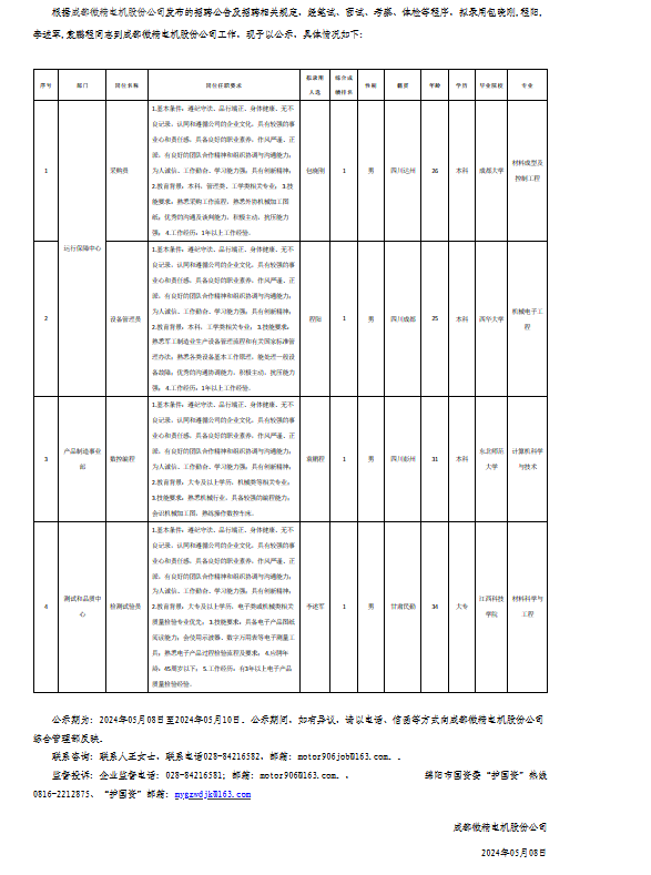 成都微精電機股份公司關于招聘采購員等崗位擬錄用人員的公示