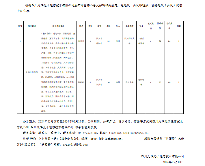 四川九華光子通信技術(shù)有限公司關(guān)于招聘人事行政專員測(cè)試成績(jī)的公示