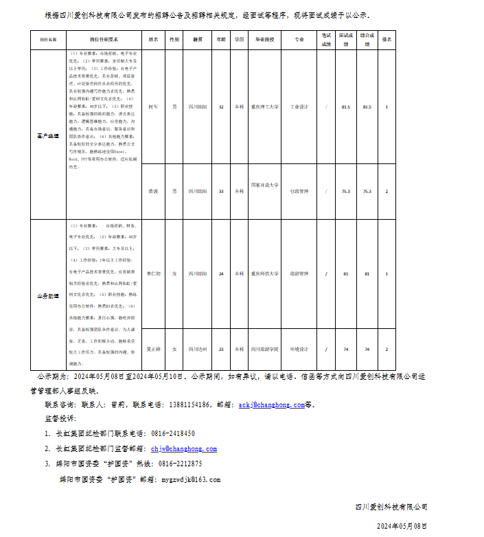 四川愛創科技有限公司關于招聘客戶經理等崗位測試成績的公示
