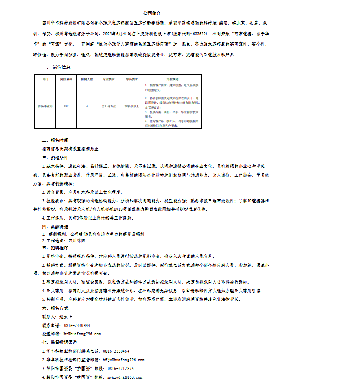 四川華豐科技股份有限公司關于招聘FAE崗位的公告