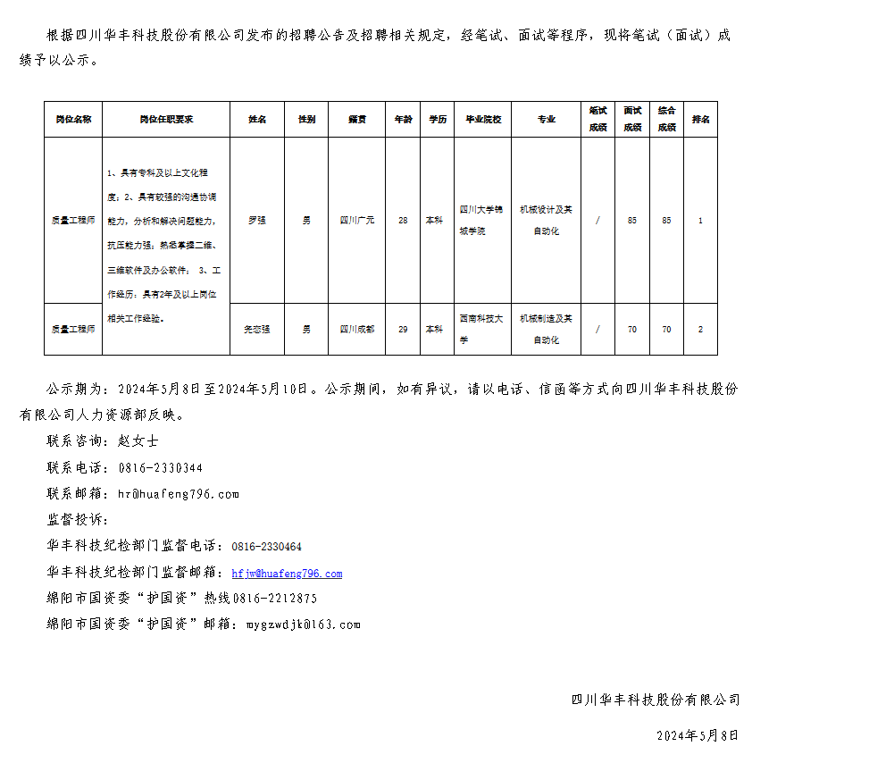 四川華豐科技股份有限公司關于招聘質量工程師崗位測試成績的公示