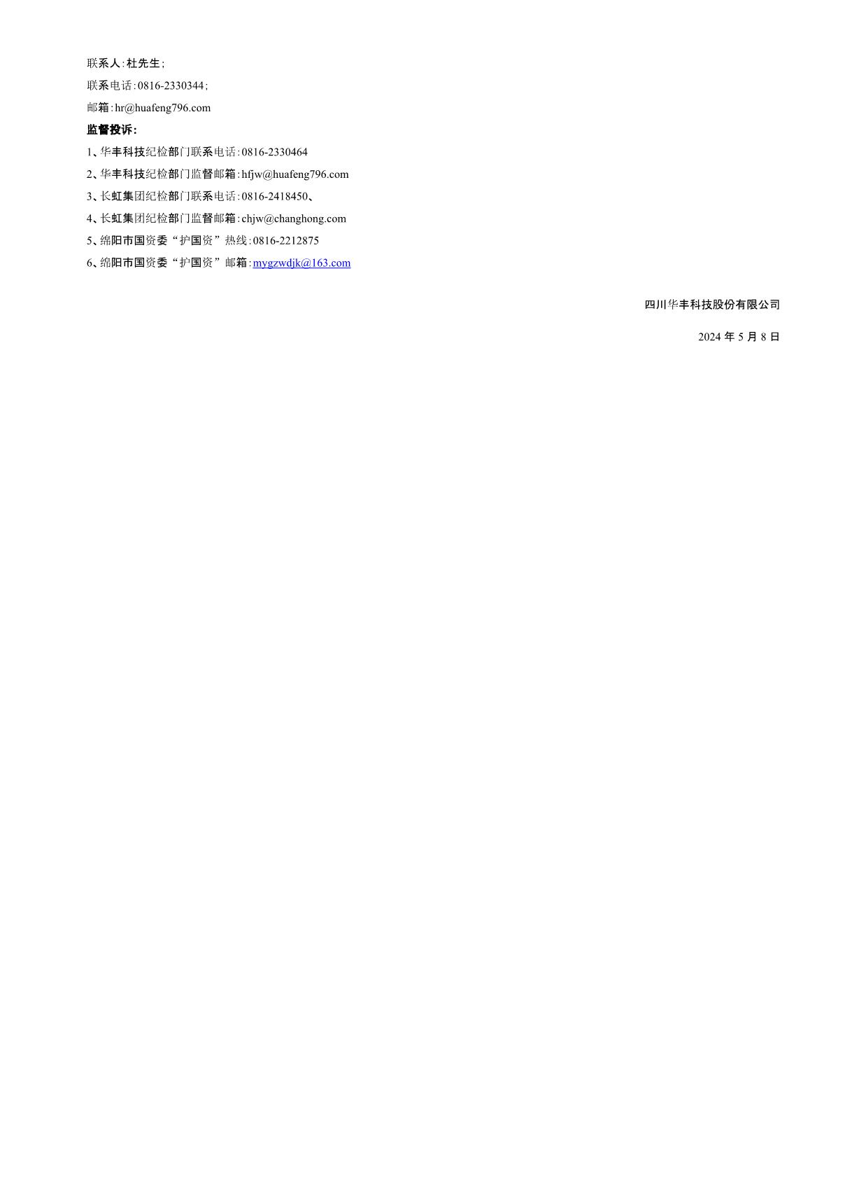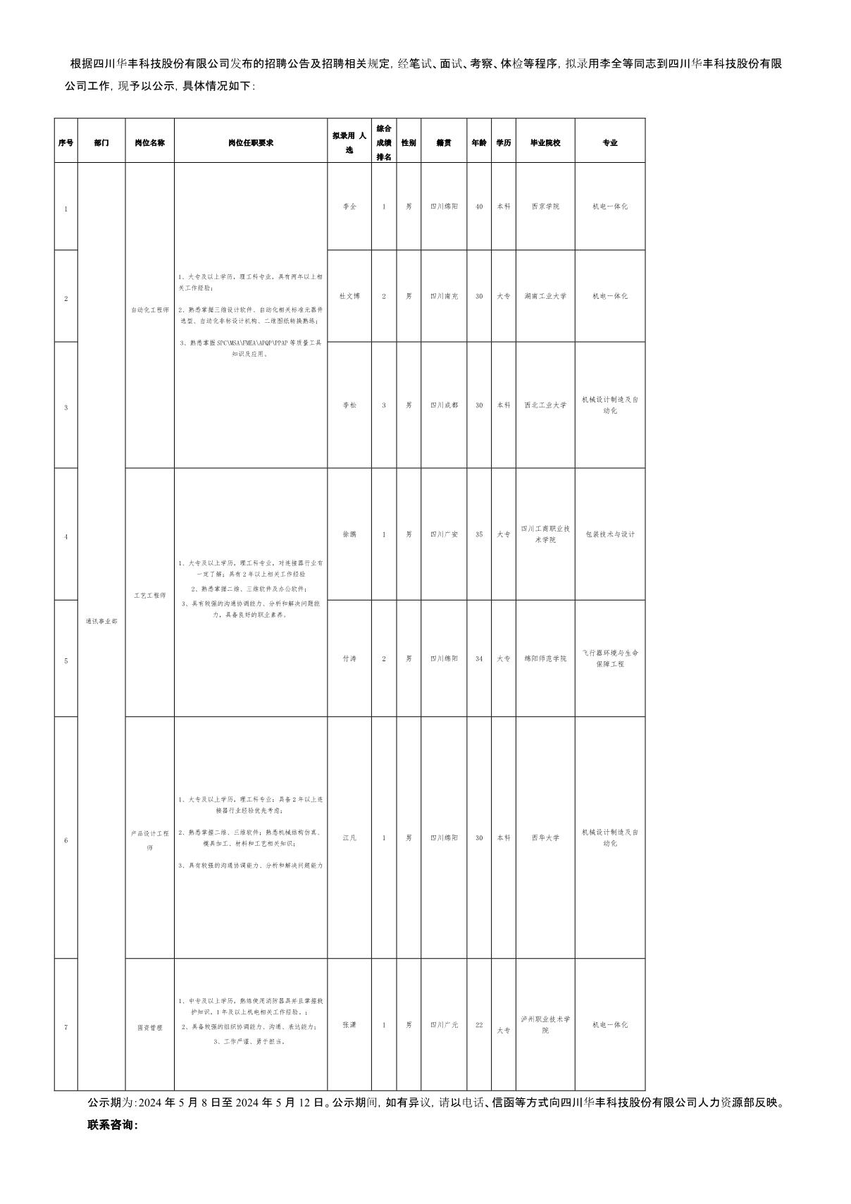 四川華豐科技股份有限公司關于招聘自動化工程師等崗位擬錄用人員公示