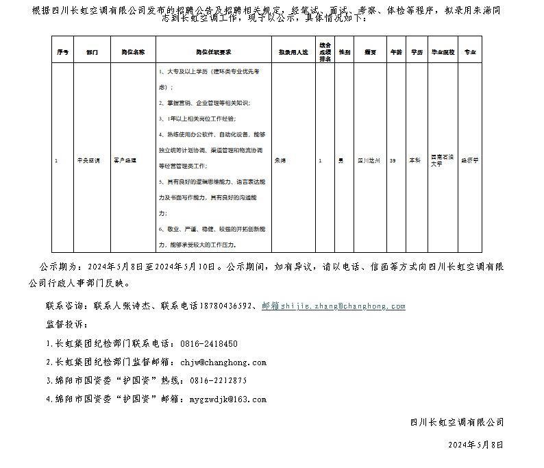 四川長虹空調有限公司關于招聘客戶經理崗位擬錄用人員的公示