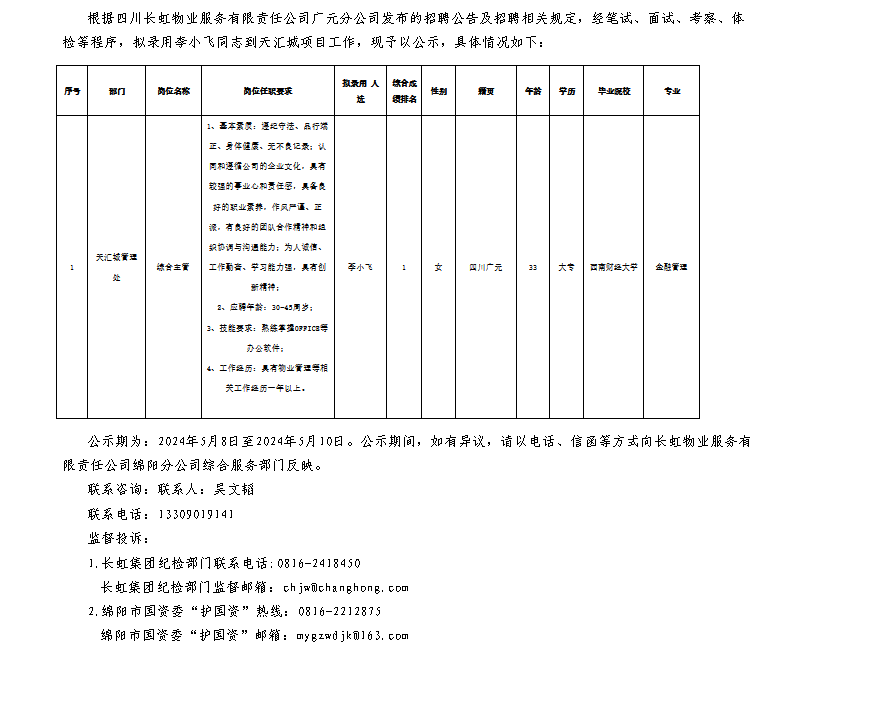 四川長虹物業服務有限責任公司綿陽分公司 關于招聘綜合主管崗位擬錄用人員的公示