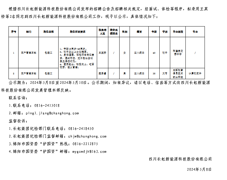 四川長虹新能源科技股份有限公司關于招聘操作職員工擬錄用人員的公示
