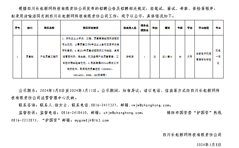 四川長虹新網科技有限責任公司關于招聘產品質量崗位擬錄用人員的公示