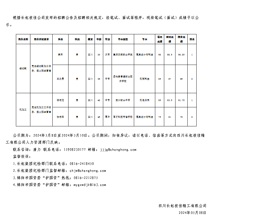 四川長虹技佳精工有限公司關于招聘線切割等崗位測試成績的公示