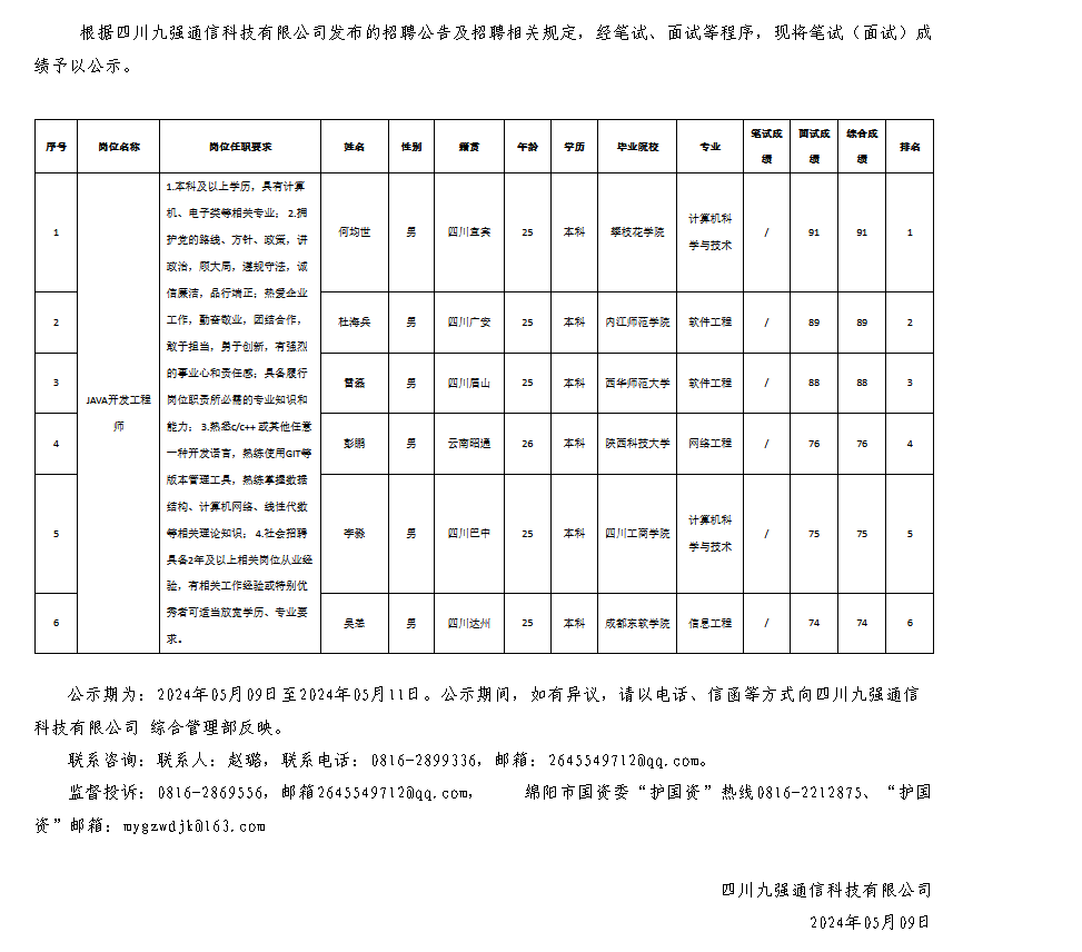 四川九強(qiáng)通信科技有限公司關(guān)于招聘JAVA開發(fā)工程師測(cè)試成績(jī)的公示