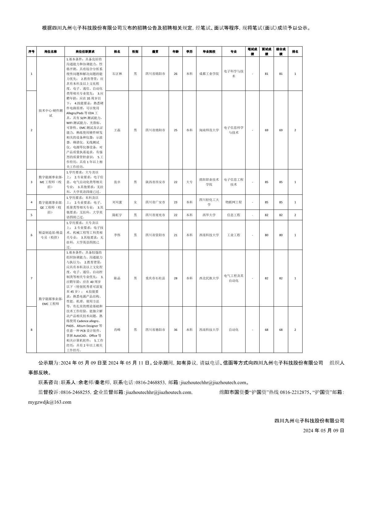 四川九州電子科技股份有限公司關于招聘精益專員(校招)等崗位測試成績的公示