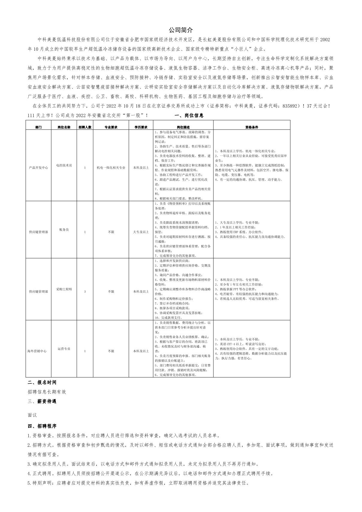 中科美菱低溫科技股份有限公司關(guān)于招聘電控技術(shù)員等崗位的公告