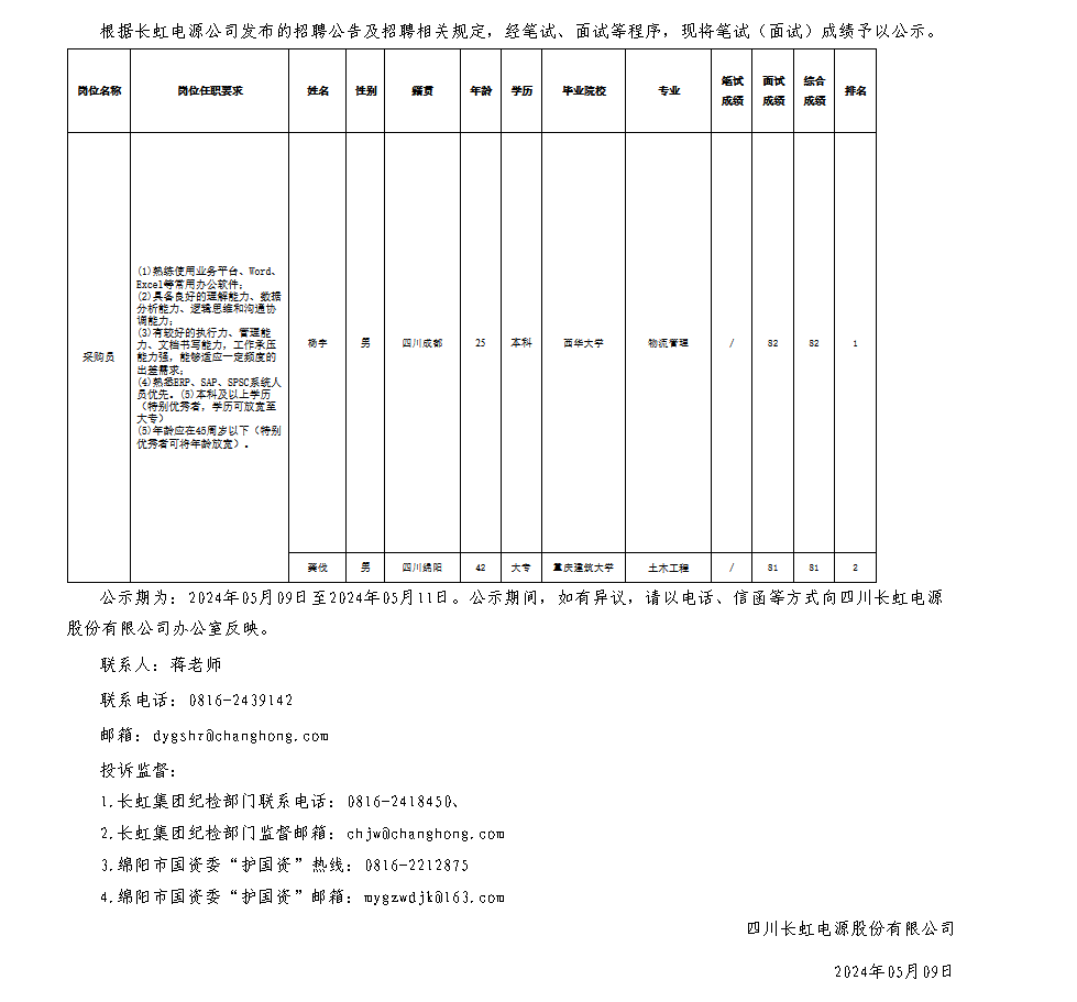 四川長虹電源股份有限公司關于招聘采購員崗位測試成績的公示