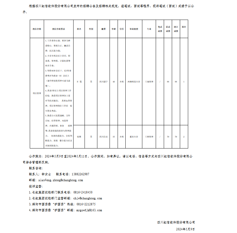 四川虹信軟件股份有限公司關(guān)于招聘項目管理崗位測試成績的公示