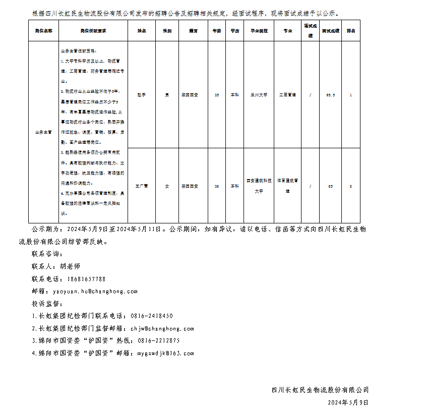 四川長虹民生物流股份有限公司關(guān)于招聘業(yè)務(wù)主管測(cè)試成績的公示
