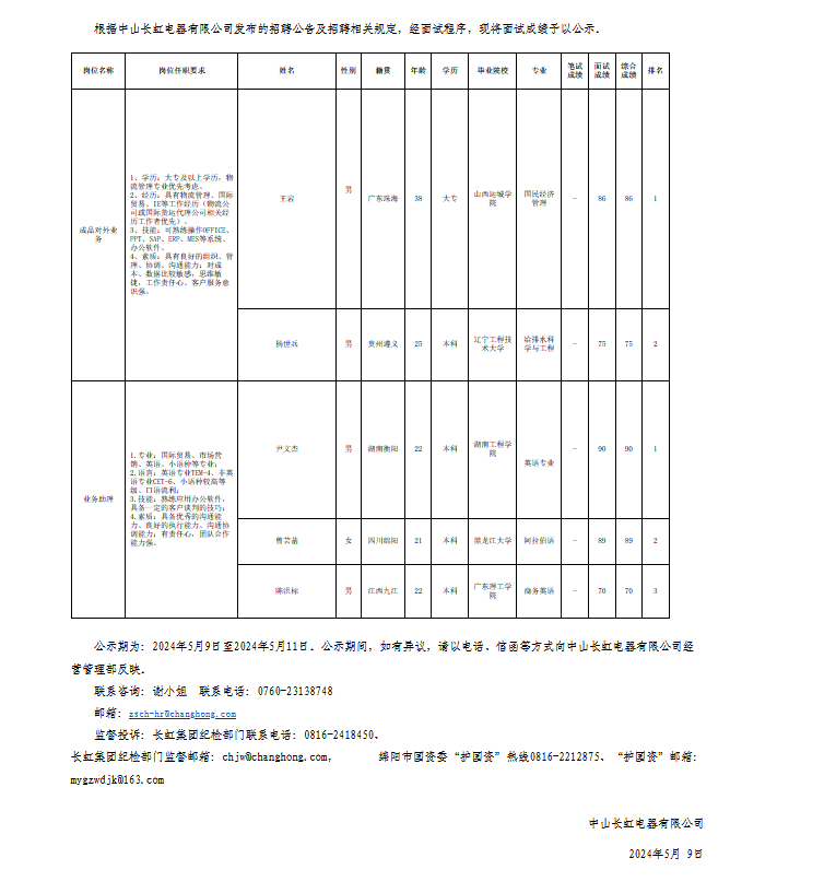 中山長虹電器有限公司關于招聘成品對外業務等崗位測試成績的公示