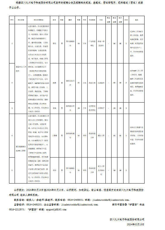 四川九州電子科技股份有限公司關(guān)于招聘PTE工程師等崗位測試成績的公示
