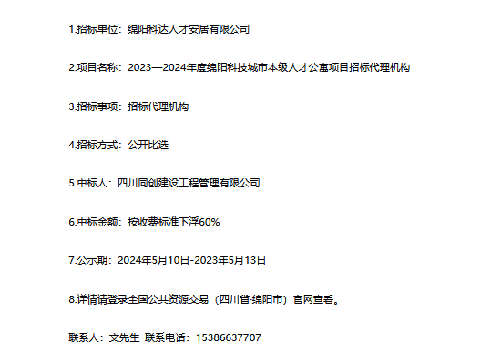 2023—2024年度綿陽科技城市本級人才公寓項目招標代理機構中標(選)結果公示