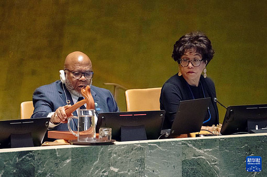 5月10日,在位于紐約的聯合國總部,聯大主席丹尼斯·弗朗西斯(左)落錘宣布決議通過。新華社發(聯合國供圖/曼努埃爾·伊萊亞斯攝)
