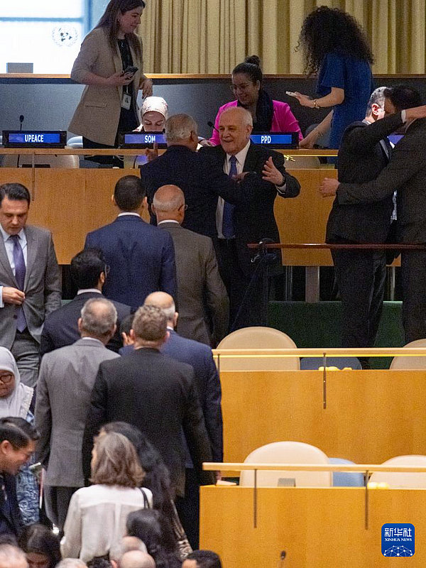 5月10日,第十次聯合國大會緊急特別會議以143票贊成、9票反對、25票棄權的表決結果通過決議,認定巴勒斯坦國符合《聯合國憲章》規定的聯合國會員國資格,應被接納為聯合國會員國。新華社發(聯合國供圖/曼努埃爾·伊萊亞斯攝)