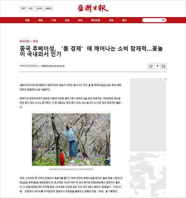 湖北春季賞花游與“五一”假期游市場成績亮眼。近日,韓國《亞洲日報》、泰國媒體Khaosod Online發(fā)表文章,高度評價湖北在推動旅游市場繁榮、豐富旅游業(yè)態(tài)、促進(jìn)消費(fèi)升級等方面的舉措,稱賞花關(guān)注熱度已轉(zhuǎn)化為經(jīng)濟(jì)能量,成為中國文旅的“頂流”,撬動了“春日經(jīng)濟(jì)”。