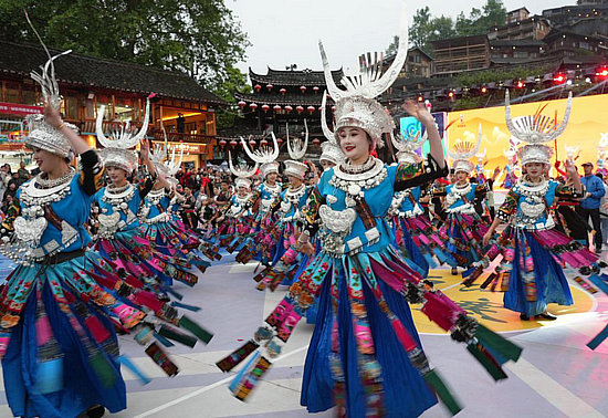 5月1日,演員在貴州省第一屆“姑媽”籃球邀請賽閉幕式上表演。新華社發(fā)(張平攝)