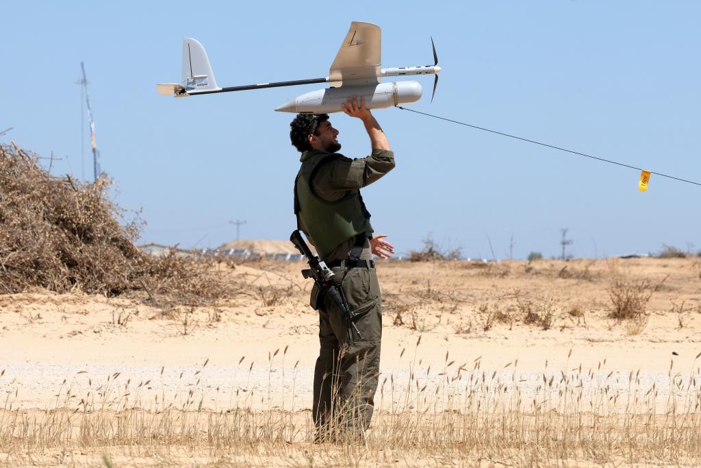 5月8日,在以色列南部凱雷姆沙洛姆口岸附近,一名以軍士兵準備放飛無人機。新華社發(伊蘭·阿薩亞格攝/基尼圖片社)