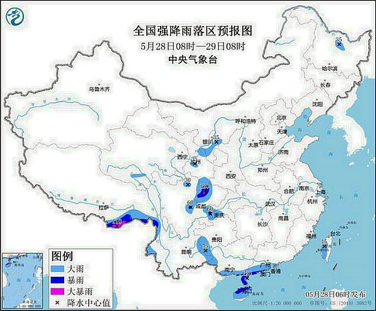 預計,5月28日08時至29日08時,廣西南部和西部、廣東西南部、海南島、貴州西南部、云南東部和西北部、四川盆地西部、重慶西部、甘肅南部、西藏東南部以及臺灣島西部等地的部分地區有大到暴雨,其中,廣東西南部、海南島北部、四川盆地西北部、西藏東南部等地局地有大暴雨(100~120毫米)。上述部分地區伴有短時強降水(最大小時降雨量30~50毫米,局地可超過60毫米),局地有雷暴大風等強對流天氣。