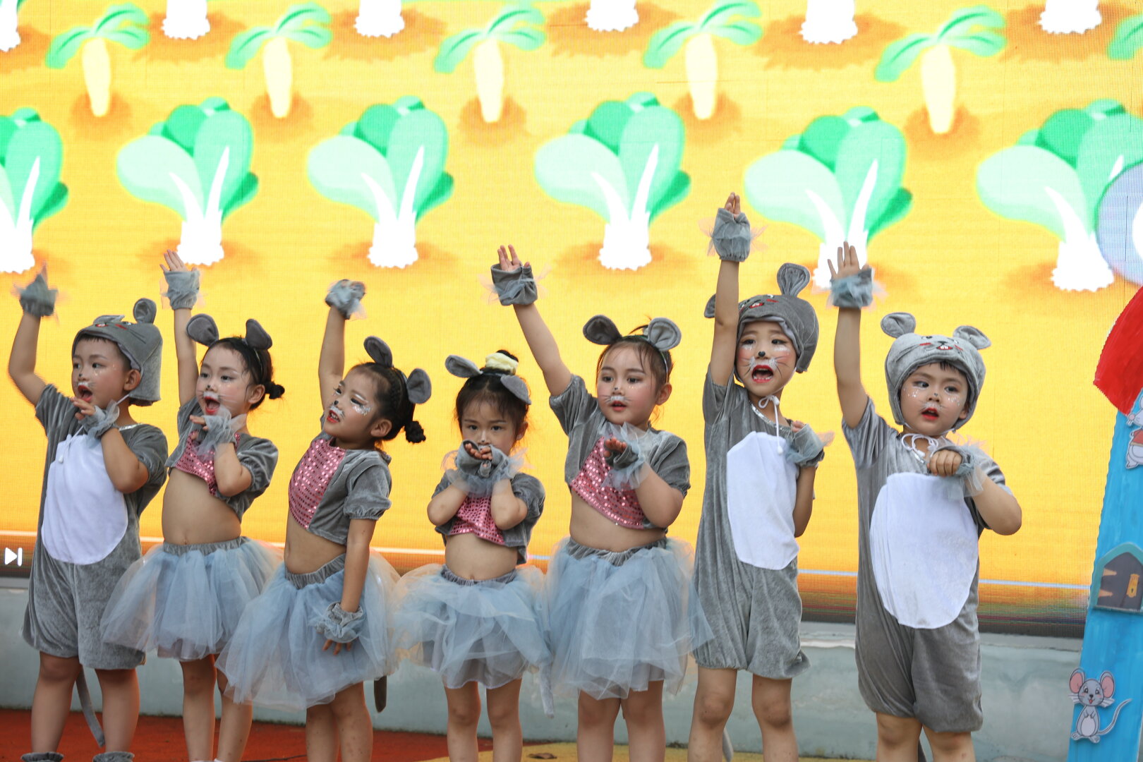 瞧!每個孩子、每位老師以及桑幼家長們都為這場盛會盛裝裝扮著。小演員想要把最甜美的笑容分享給在場的每一個人,每個孩子心中都有一個五彩繽紛的童話夢,《一園青菜成了精》《老虎照鏡子》《小蝌蚪找媽媽》等有趣的劇目形象,生動的故事情節,都深深地吸引著孩子們。