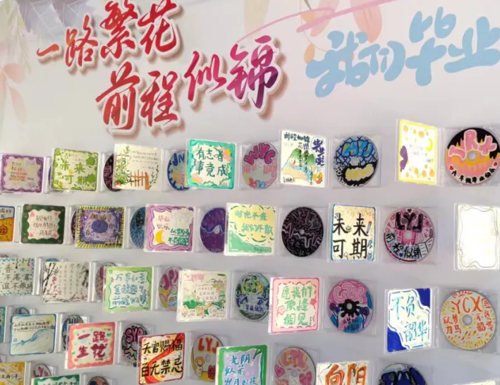 六年級的孩子們以“一路繁花,前程似錦”為主題,利用 CD光盤為材料,以桃花作封面,寓意孩子們?nèi)缡㈤_的桃花,內(nèi)側(cè)書寫畢業(yè)寄語和名字字母加上涂鴉繪畫,一張張小小的CD,寄予對母校的祝愿。