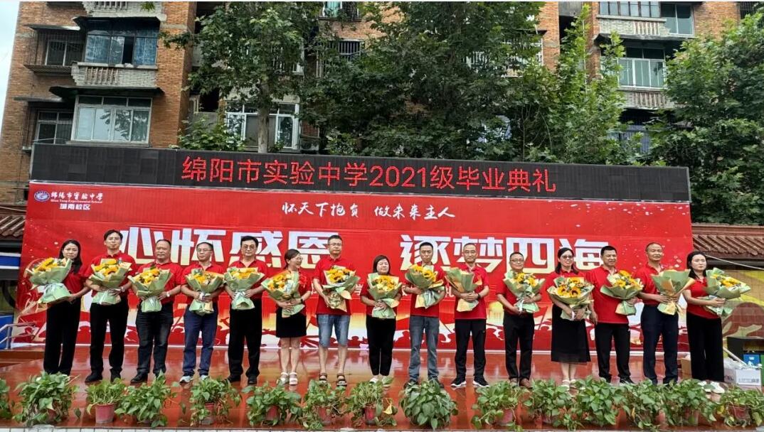 6月12日17時,剛剛參加完中考的綿陽市實驗中學(綿陽七中)初2021級學子在班主任老師的帶領下,在學校領導、老師和家長們熱烈的歡呼聲、鼓掌聲和祝賀聲中,有序地進入學校,他們腳踏紅地毯,自信滿滿地穿過巍然聳立的“凱旋門”,參加學校舉行以“心懷感恩,逐夢四海”為主題的畢業典禮活動。