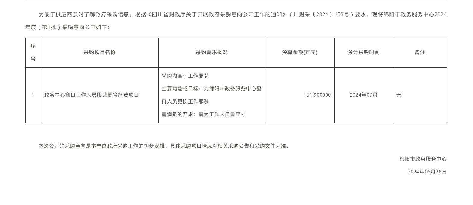 綿陽市政務服務中心2024年度政府采購意向公告(第1批)