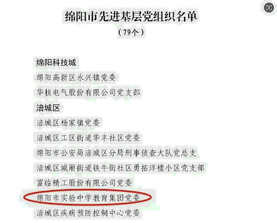綿陽新聞網訊 近日,中共綿陽市委公開了綿陽市優秀共產黨員、優秀黨務工作者、先進基層黨組織名單,綿陽市實驗中學教育集團黨委榮獲“綿陽市先進基層黨組織”稱號。