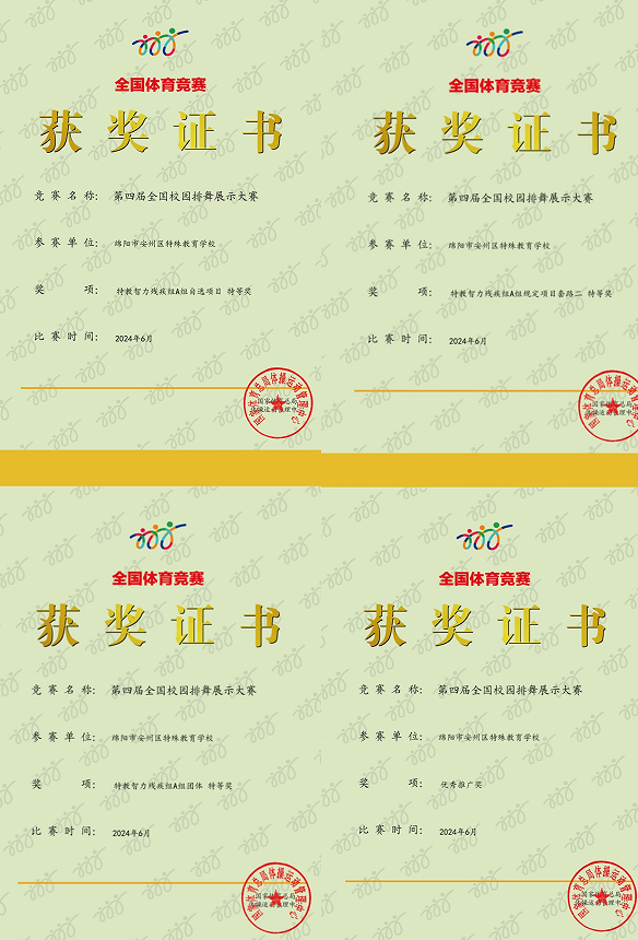 本賽事是由國家體育總局體操運動管理中心主辦,來自全國數百個學校參與比賽,組委會通過線上打分,面向全國現場直播,該校推送的兩個學生排舞視頻,獲得評委的一致好評,均獲得智力殘疾A組規定套路和自選項目最高分,徐靜、馮家麗、張紅梅、陳治衡四位老師榮獲優秀教練員稱號。