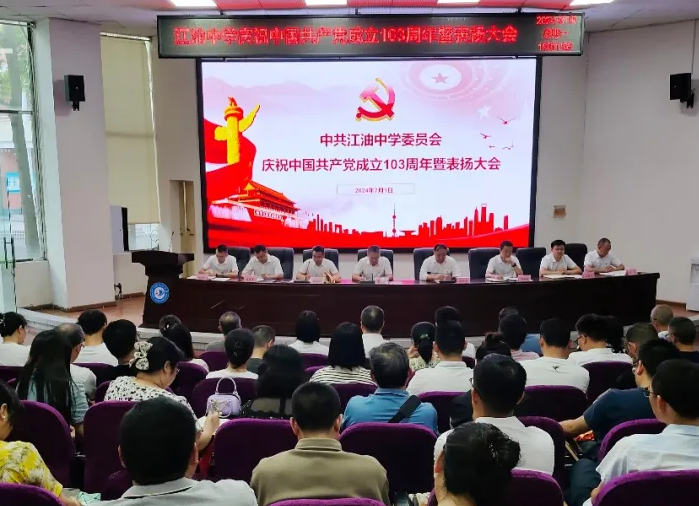 綿陽新聞網訊 為了慶祝中國共產黨成立103周年,表彰激勵先進,再鼓奮斗干勁,推進學校發展,7月1日下午,中共江油中學委員會在學校第一學術廳召開了慶祝中國共產黨成立103周年暨表揚大會,該校黨委委員、全體黨員同志、入黨積極分子及發展對象齊聚一堂,回顧黨的光輝歷史,謳歌黨的豐功偉績,慶祝黨的103歲生日。會議由黨委副書記、校長段懷金主持。