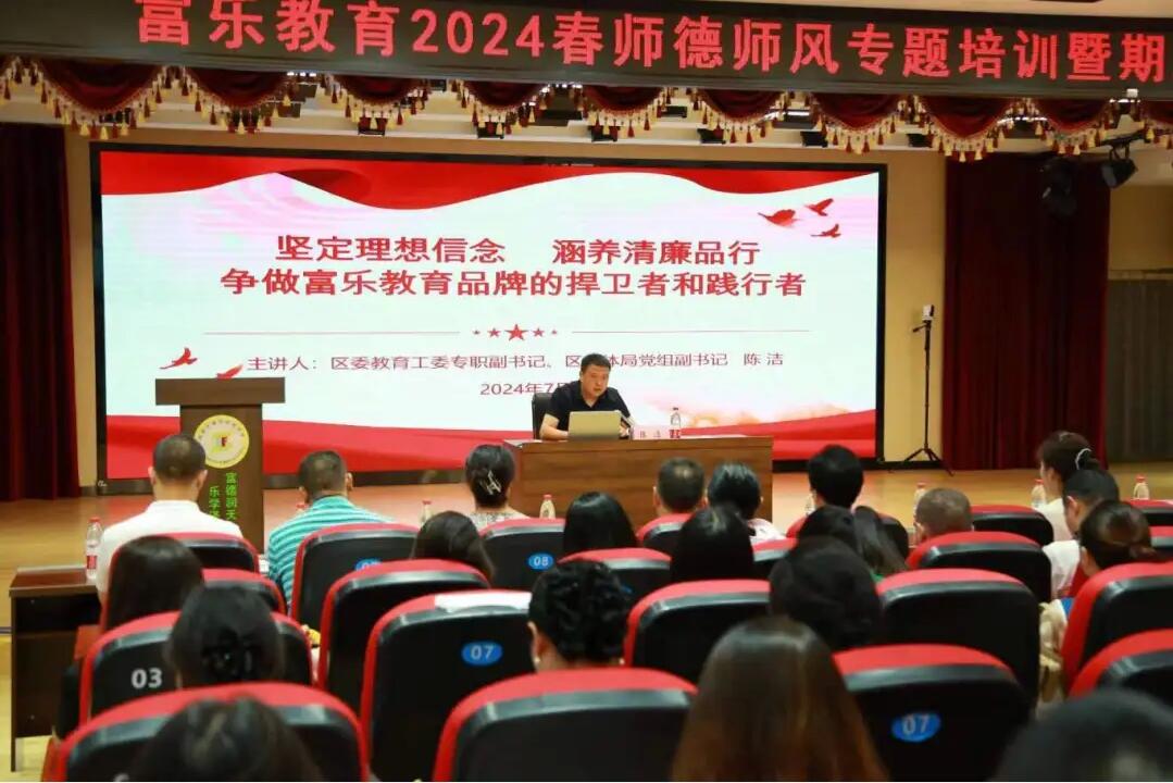 為了進一步加強教師隊伍建設,提高教職工的政治思想素質和業務水平,規范教師職業道德行為,為推動富樂教育健康發展注入新的活力。7月8日上午9時,綿陽市富樂實驗中學在二中校區學術報告廳開展了“涵養師德師風 做新時代人民教師”為主題的2024年春季學期師德師風專題培訓暨教職工集中政治學習活動。