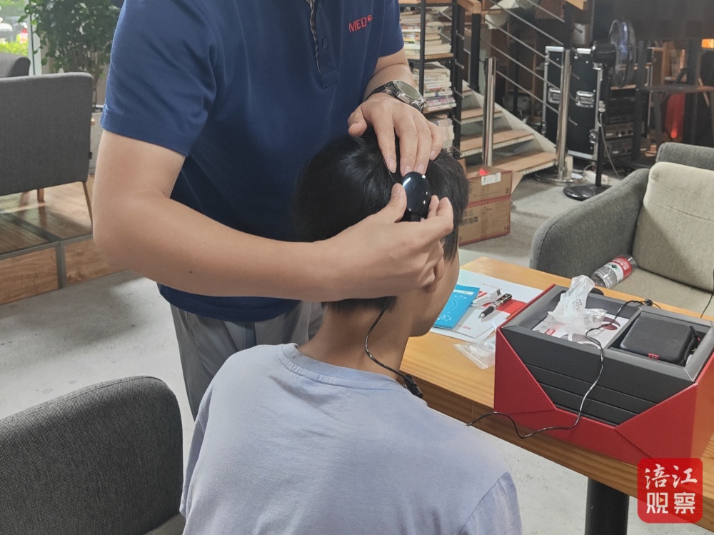 “這款耳蝸是我們最新的產品,不僅操作更為便捷,還實現了無線充電功能,續航長達18小時,音質也更加柔和舒適。”黃良威一邊介紹一邊細心為小峰調試新耳蝸。