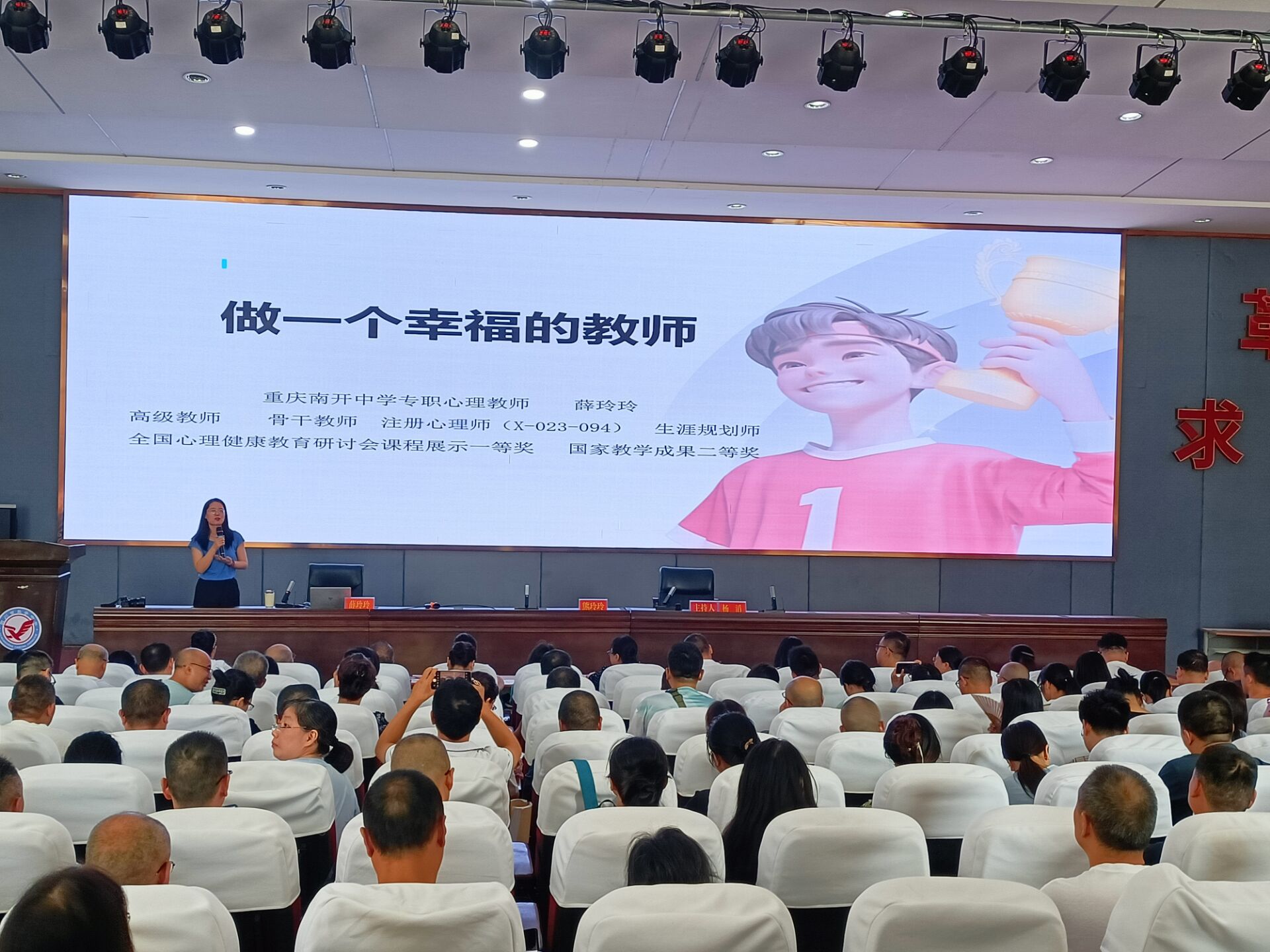 郭在時老師以《新課改背景下課堂質量提升》為題,分析了新課改背景下課堂教學的現狀與面臨的挑戰,并結合自己的多年的教學實踐經驗,向老師們進行了深入淺出的講解。心理學專家薛玲玲老師以《做一個幸福的教師》為題,以自己多年從事學生心理工作的典型案例,向老師們闡述了如何釋放工作中的壓力,如何在職業倦怠中尋求自我成長與幸福感,如何幫助學生實現心理困境的突圍等一系列老師們極為關注的話題。