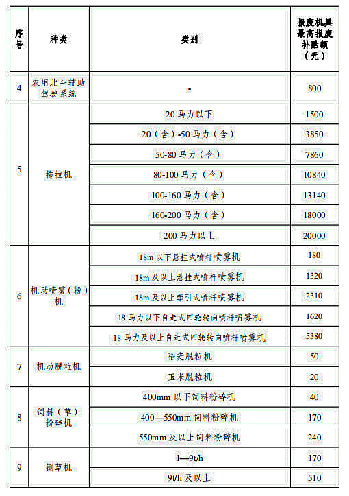 報廢部分實行定額補貼。其中:拖拉機、三大糧食作物聯合收割機、播種機和農用北斗輔助駕駛系統報廢按照農業農村部、財政部發布的最高補貼額予以補貼。農用北斗輔助駕駛系統報廢補貼申領要以購置新設備為前提,按照800元予以補貼。其他農機報廢,按照同類型農機購置與應用補貼額30%測算,并綜合考慮運輸拆解成本等因素確定,單臺農機報廢補貼額不超過2萬元。報廢聯合收割機、播種機、水稻插秧機并新購置同種類機具,在上述補貼標準基礎上,按照50%的比例提高報廢補貼標準,單臺最高報廢補貼額不超過3萬元。