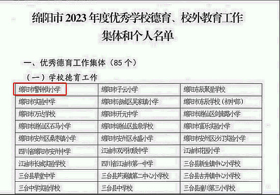 綿陽新聞網訊 近日,按照綿陽市教育和體育局關于評選綿陽市2023年度優秀學校德育工作集體的工作安排,綿陽市警鐘街小學脫穎而出,榮獲綿陽市2023年度優秀德育工作集體榮譽稱號。
