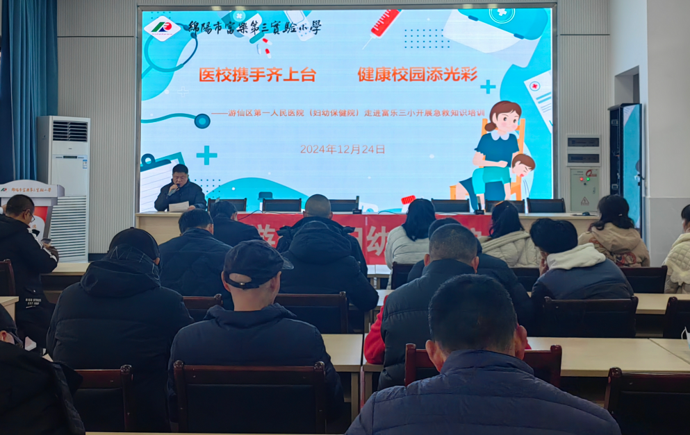 為了進一步普及急救知識,提高全體教職工應對突發事件的反應及處置能力。2024年12月24日,綿陽市富樂第三實驗小學聯合游仙區第一人民醫院,開展了2024年秋急救知識進校園活動。本次活動旨在通過專業知識講解與實際操作,讓老師們掌握基本的心肺復蘇及海姆立克急救法,營造安全和諧的校園環境。