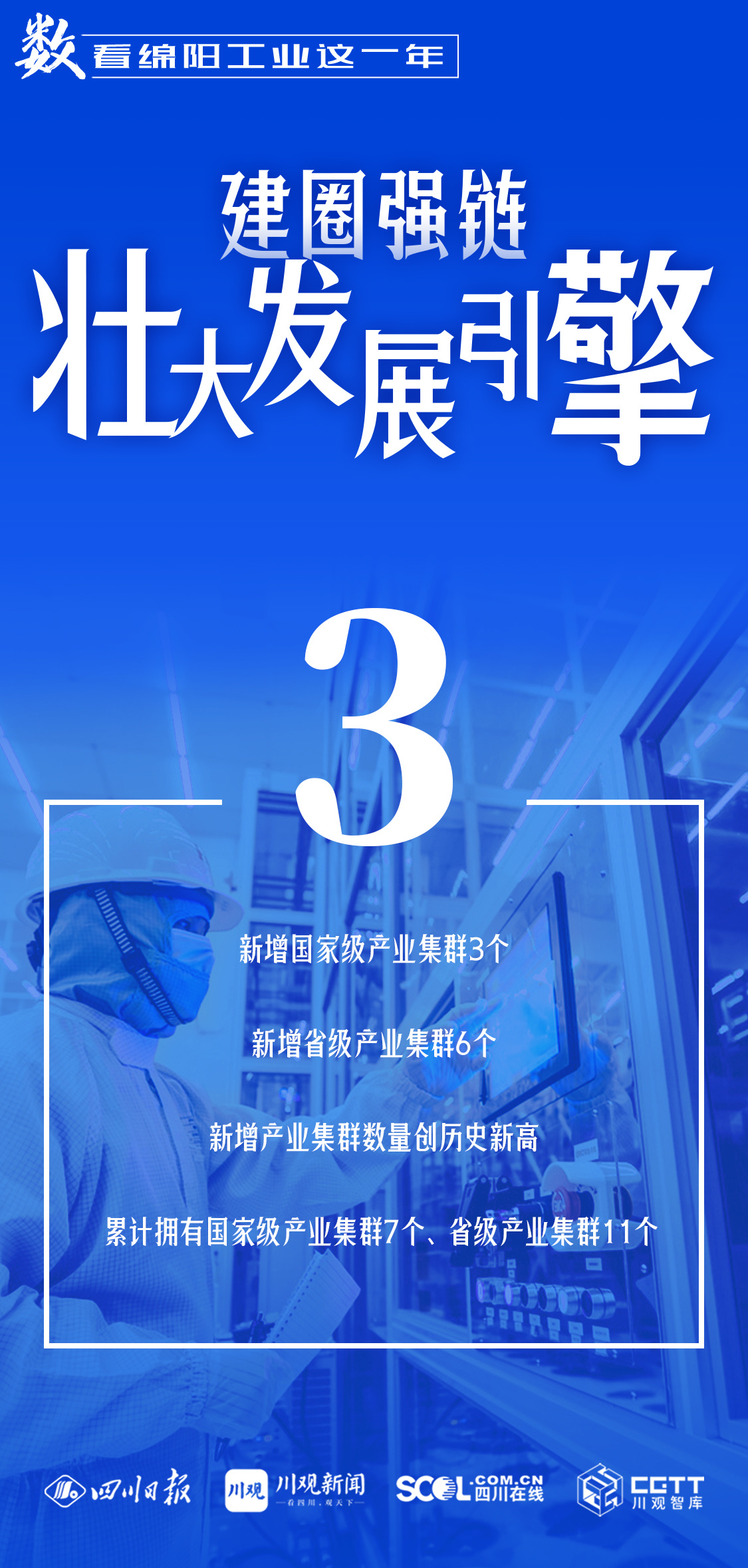 2024年,綿陽新增國家級產業集群3個,新增省級產業集群6個,新增產業集群數量創歷史新高;綿陽入選全國市級地方政府制造業數字化轉型典型案例城市、為西部唯一;綿陽位列“2024先進制造業百強市”榜單59位、較上年提升9位,全省進位最快……