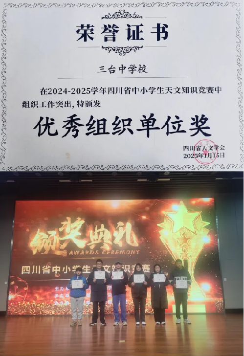 2025年1月19日,四川省中小學生天文知識競賽頒獎儀式在成都舉行。三臺中學12名師生榮獲省級獎勵,學校榮獲優秀組織單位獎。