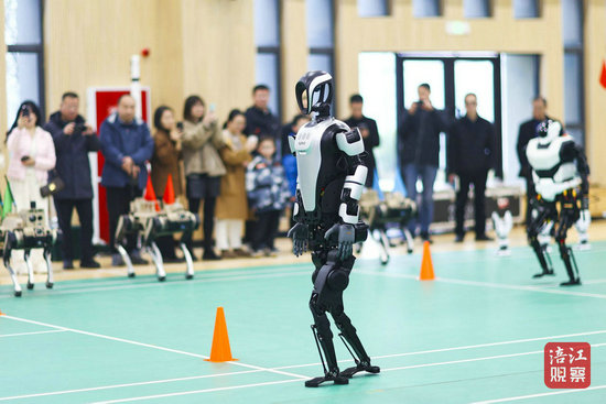在人機共舞環節,綿陽實驗高級中學健美操隊運動員與天鏈機器人T1默契配合,整齊劃一的動作展現了人機融合的和諧美感。在百米比賽中,四只身披彩旗的四足機器人——兵裝自動化所公司機器狼向著終點快速前進,小家伙們可愛的模樣和賣力奔跑的樣子讓現場觀眾驚嘆不已。