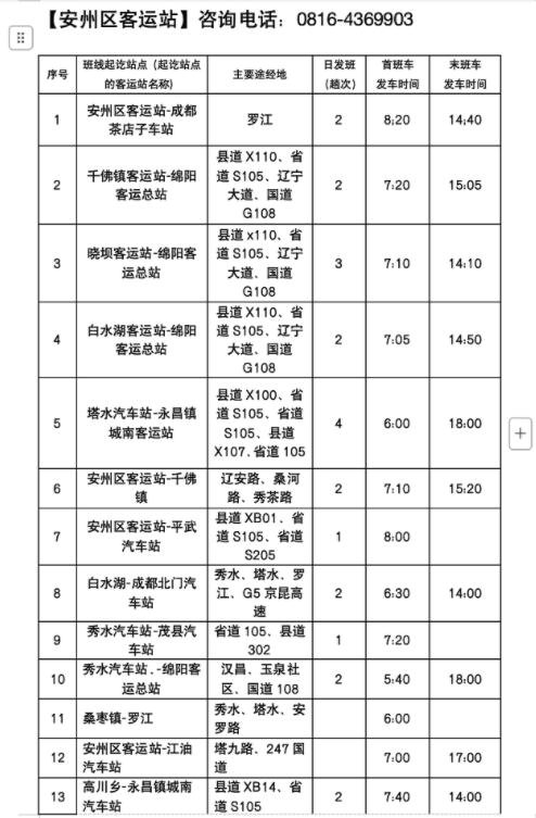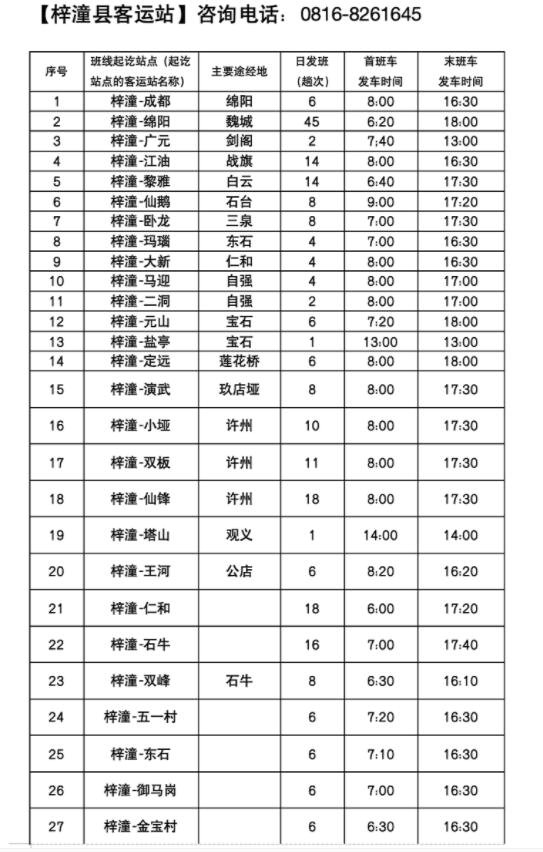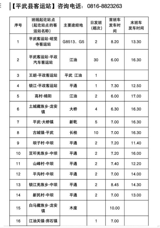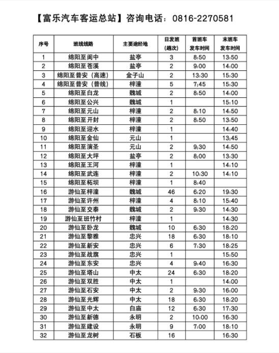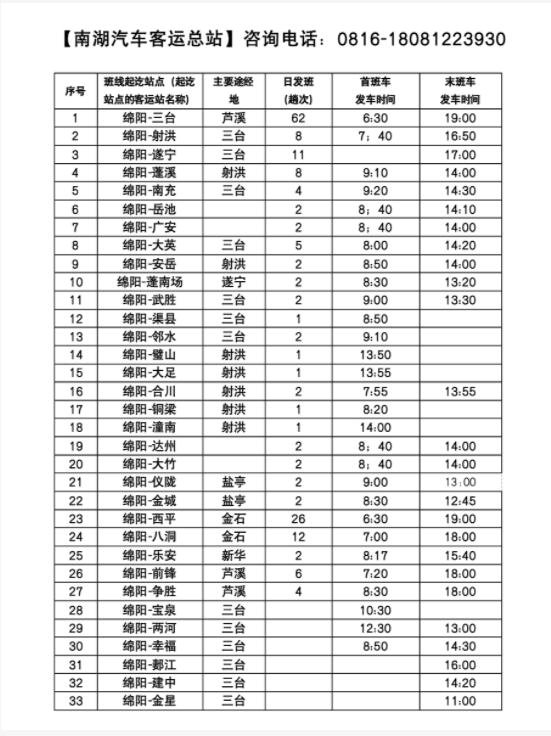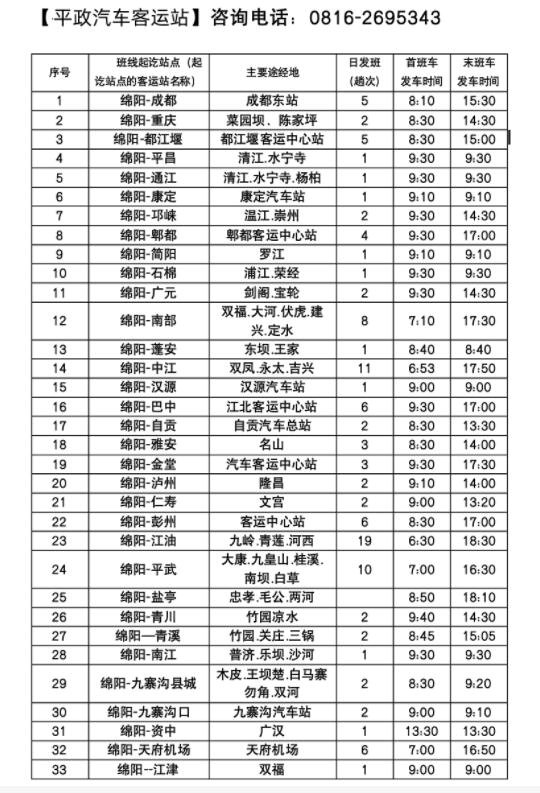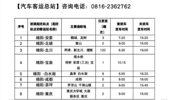 綿陽新聞網訊 目前,綿陽各大汽車站已迎來出行客流高峰。為了大家平安便利出行,記者將全市各車站主要班次時刻表進行了匯總,建議有出行需求的旅客提前了解、規劃乘車時間、路線。