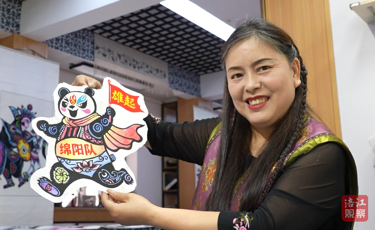 蘭小奇是省級非遺“三臺剪紙”的代表性傳承人,她將脫稿剪紙技法與足球文化結合,在作品中融入川超聯賽的標識元素和四川地方文化符號,展現了非遺藝術在體育賽事中的創新應用。